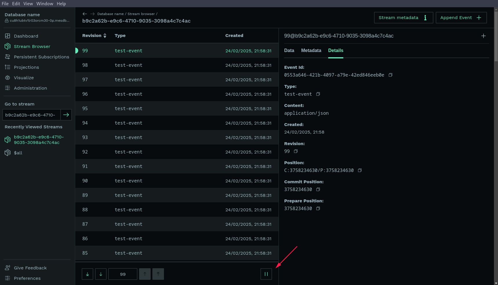 The stream browser subscribes to the stream, so new events are streamed in automatically.